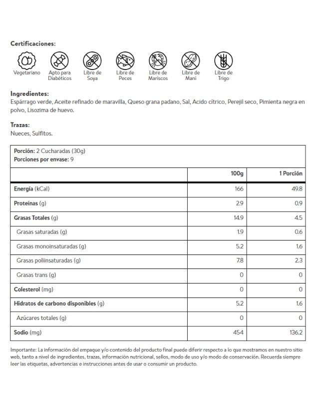 Ingredientes: Espárrago verde, aceite refinado de maravilla, queso grana padano, sal, ácido cítrico, perejil seco, pimienta negra en polvo