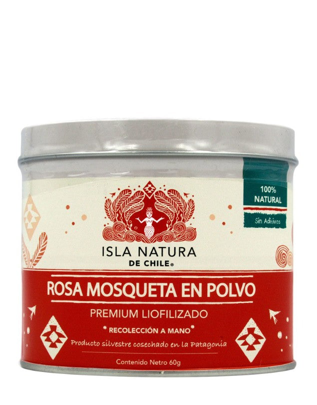 Rosa mosqueta en polvo premium liofilizado, 60 gr. Isla Natura. Mantiene todas sus propiedades naturales intactas, especialmente su alto contenido de Vitamina C. Su ingesta, favorece la resistencia del organismo a diversas enfermedades sobre todo problemas bronquiales y de resfrio/gripe.