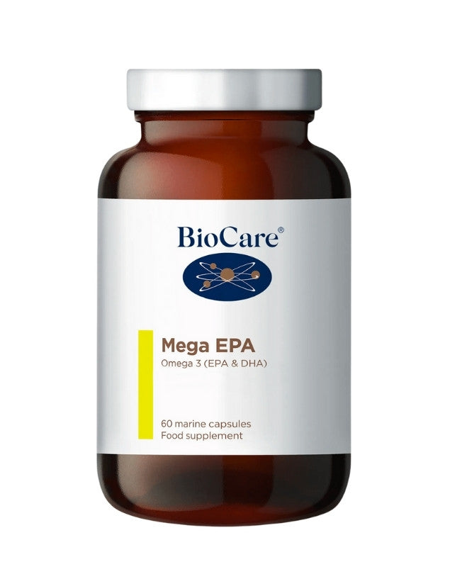 Omega 3 Mega EPA Aceite de Pescado, 60 cáps. BioCare. Cápsula blanda de alta potencia que contiene ácidos grasos Omega-3 (EPA y DHA) procedentes de aceite de pescado puro (sardinas y anchoas).