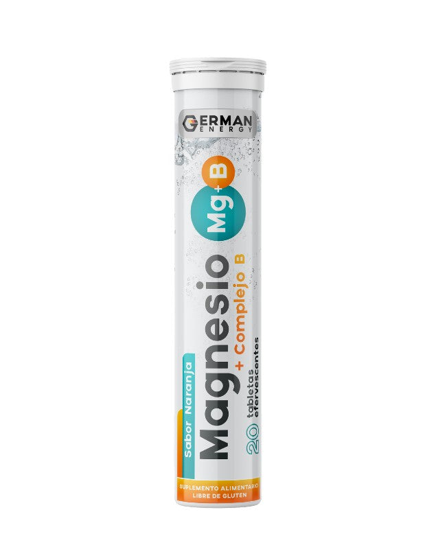 Magnesio + Complejo B naranja, 20 tabletas. German Energy. Suplemento alimentario efervescente de naranja, contiene vitaminas del grupo B y magnesio. Aporta al funcionamiento grupos musculares y sistema nervioso. Apto para Veganos y libre de gluten.