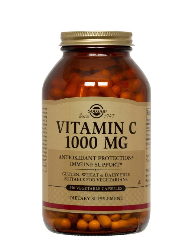 Vitamina C 1000mg, 250 cápsulas. Marca Solgar. La vitamina C posee un alto poder antioxidante, el que ayuda a combatir los radicales libres, sustancias que aceleran el envejecimiento prematuro y afectan a las membranas de los vasos sanguíneos.