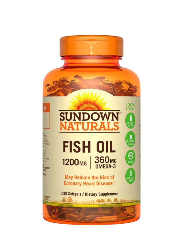 Aceite de Pescado (Fish Oil) Omega 3, 1200 mg, 200 softgel, Sundown. Contiene 1200mg de aceite de pescado concentrado. Cada cápsula aporta 360mg de ácidos grasos Omega 3 (EPA y DHA) que contribuyen a mejorar y proteger la salud cardiovascular. Además tiene acción antiinflamatoria y forma parte importante del tejido nervioso y de la retina. El DHA es un ácido graso esencial que favorece el desarrollo del cerebro y de la visión durante la gestación y los primeros años de vida.