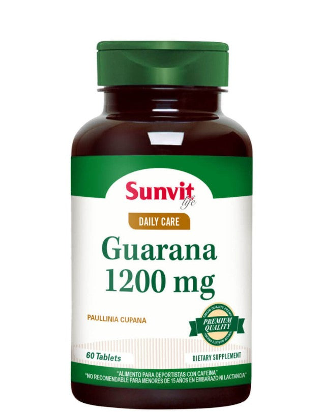 Guaraná 1200 mg, 60 tabs. Marca Sunvit. Guaraná es un estimulante y energizante natural que mejora la resistencia al cansancio y fatiga. Por otro lado presenta un efecto acelerador del metabolismo, resultando útil para complementar cualquier rutina deportiva.
