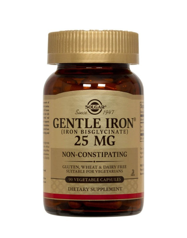 Hierro 25 mg. 90 caps, marca Solgar. Fórmula vegana, libre de lactosa y de gluten.