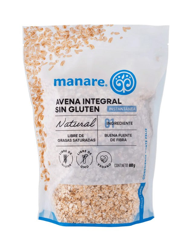 Avena Integral, Libre de Gluten, Instantánea, 800 g. Manare. Avena sin gluten, ideal para quienes buscan opciones seguras y saludables en su dieta diaria. La avena instantánea es una excelente opción para desayuno o snack.