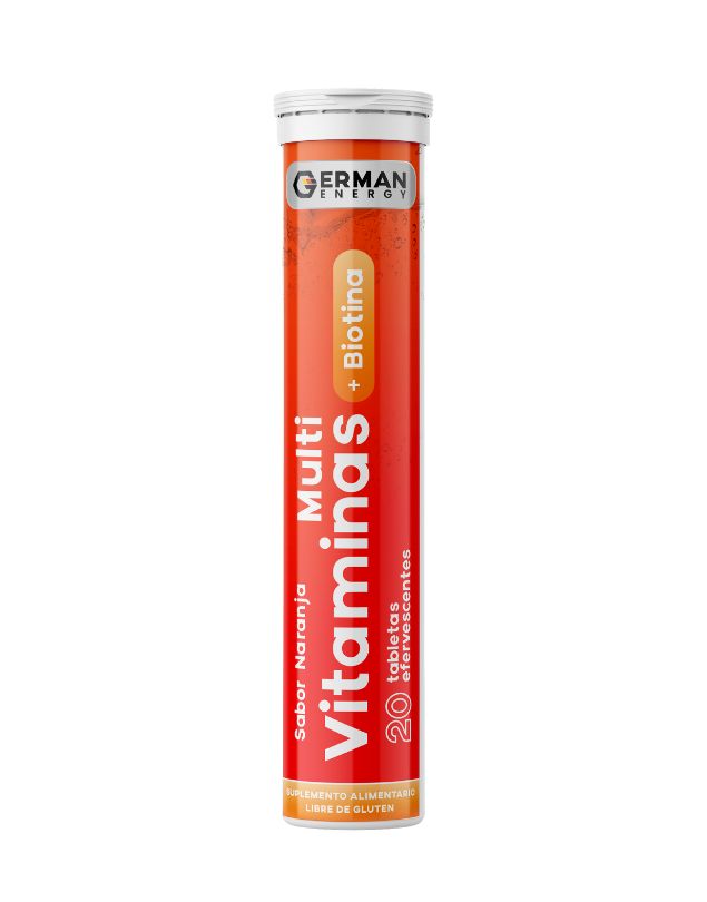 Bioplus + Probióticos, 20 tabletas. German Energy. Suplemento alimentario efervescente de naranja, contiene vitaminas de diferentes grupos, nueve minerales diferentes y ginseng. Libre de gluten.