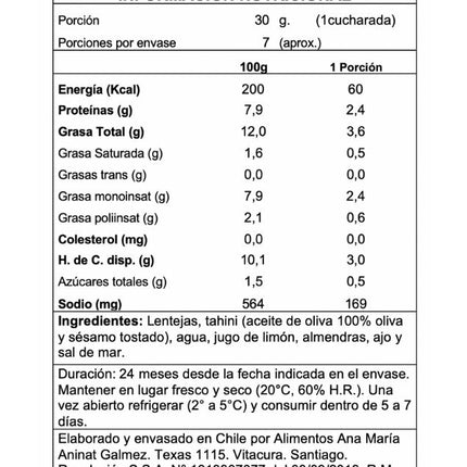 Ingredientes: Lentejas, tahini (aceite de oliva 100% oliva y sésamo tostado), agua, almendras, sal de mar, ajo y limón.