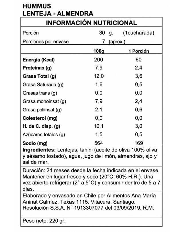 Hummus de lenteja y almendra 100% natural hecho en Chile, sin preservantes. Vegano y sin gluten.