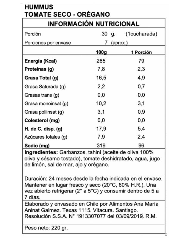 Ingredientes: Garbanzos, tahini (aceite de oliva 100% oliva y sésamo tostado), tomate deshidratado, agua, jugo de limón, sal de mar, orégano y ácido cítrico.
