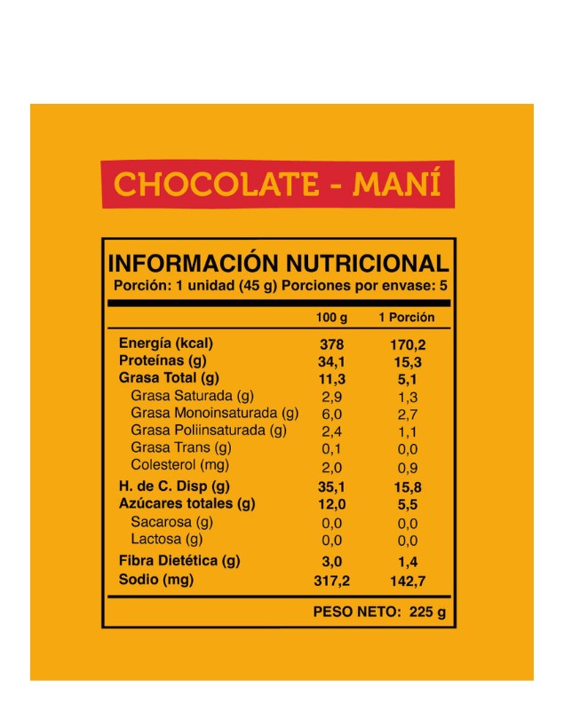 Barra proteica con 15 g de proteína, con todos los aminoácidos esenciales sin azúcar añadida, bajo en sodio, sin preservantes. Ingredientes Dátiles, crisp de soya (aislado de proteína de soya, cacao, almidón de tapioca), maní 22%, maltitol, proteína de suero de leche, chocolate 5% (cacao en pasta, maltitol, polidextrosa, lecitina de soya, polirricinoleato de poliglicerol, SUCRALOSA (3,35 mg/100g - 1,51 mg/porción - IDA 0-15 mg/kg de peso corporal), saborizante idéntico al natural).