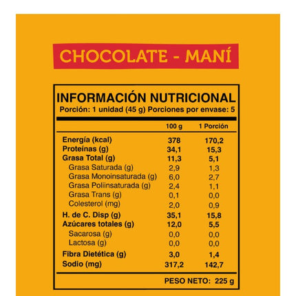 Barra proteica con 15 g de proteína, con todos los aminoácidos esenciales sin azúcar añadida, bajo en sodio, sin preservantes. Ingredientes Dátiles, crisp de soya (aislado de proteína de soya, cacao, almidón de tapioca), maní 22%, maltitol, proteína de suero de leche, chocolate 5% (cacao en pasta, maltitol, polidextrosa, lecitina de soya, polirricinoleato de poliglicerol, SUCRALOSA (3,35 mg/100g - 1,51 mg/porción - IDA 0-15 mg/kg de peso corporal), saborizante idéntico al natural). Atributos 15 grs. de Proteína. Sin azúcar añadida Sin sellos Bajo en sodio y colesterol. Fabricado en Chile Sin preservantes. 45 g cada barrita.