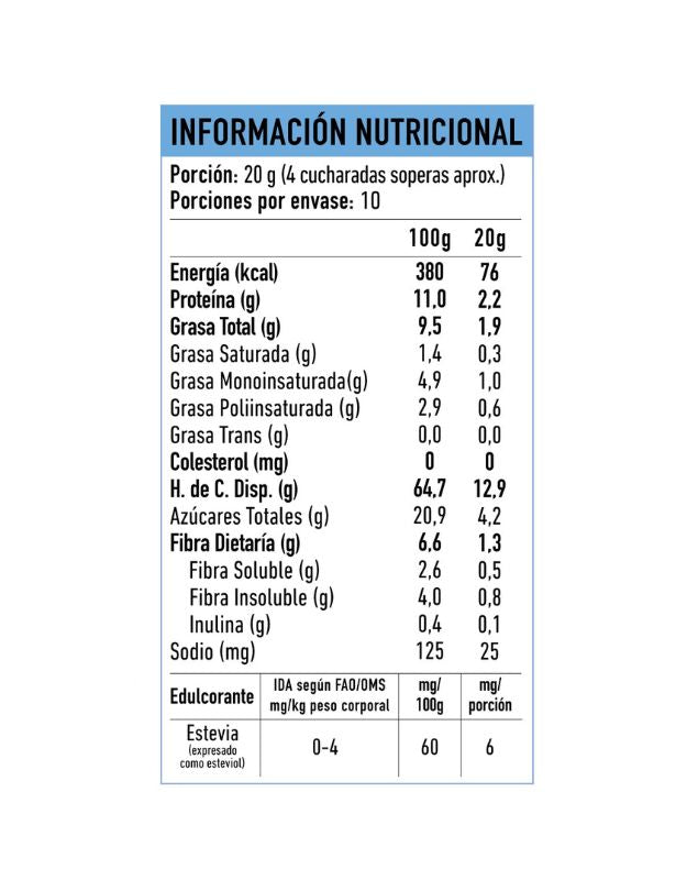 Lista para consumir, pruébala con leche, yogurt y frutas, pero también atrévete a usarla en galletas, queques y colaciones salvajes para tu familia.