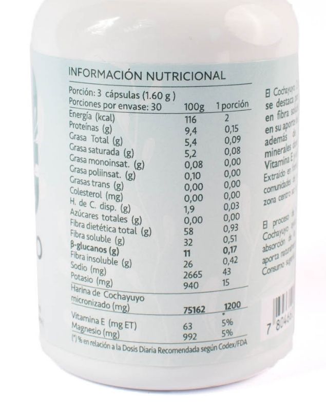 400 mg por cápsula y 90 cápsulas por frasco. Harina micronizada, de excelente absorción y biodisponibilidad