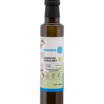 Aceite de Coco MCT, Sin Olor, Sin Sabor, 250 ml. Manare. Fuente natural de energía rápida y limpia, ideal para café, batidos y recetas saludables. Perfecto para un estilo de vida activo.