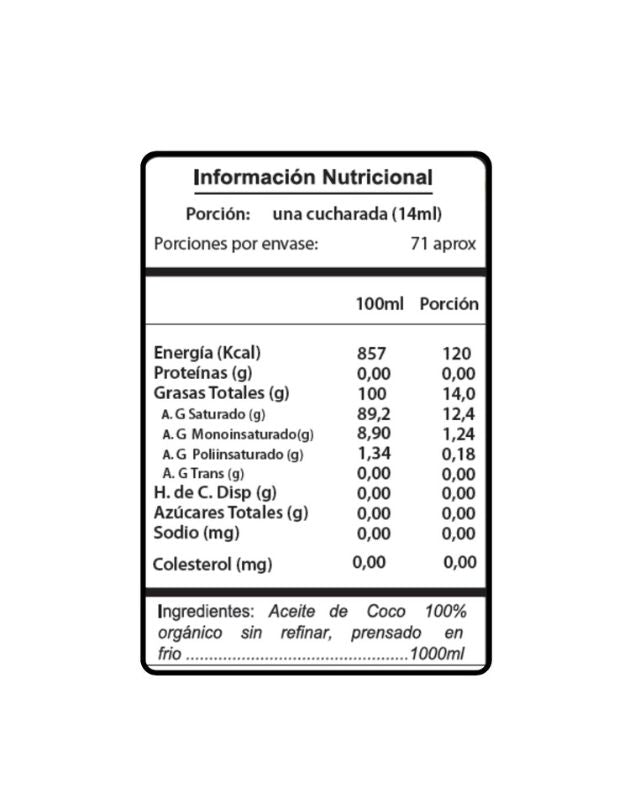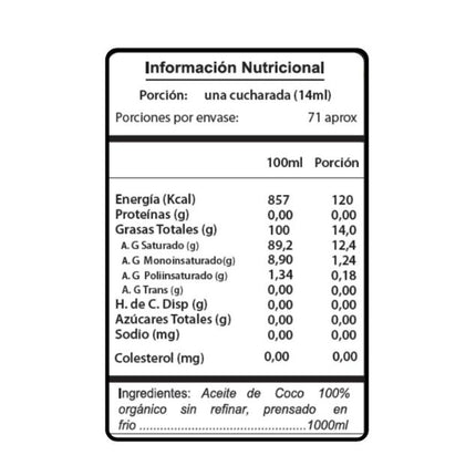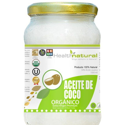 Aceite de Coco Orgánico, 1000 ml. Health Natural. El aceite de coco es un aceite vegetal, prensado en frio, sin hexano, cero grasas trans, cero grasas hidrogenada, extra virgen, sin refinar, sin blanquear. 100% pura pulpa blanca del coco prensado al frio.