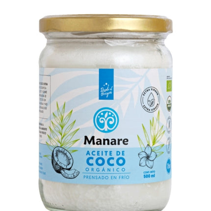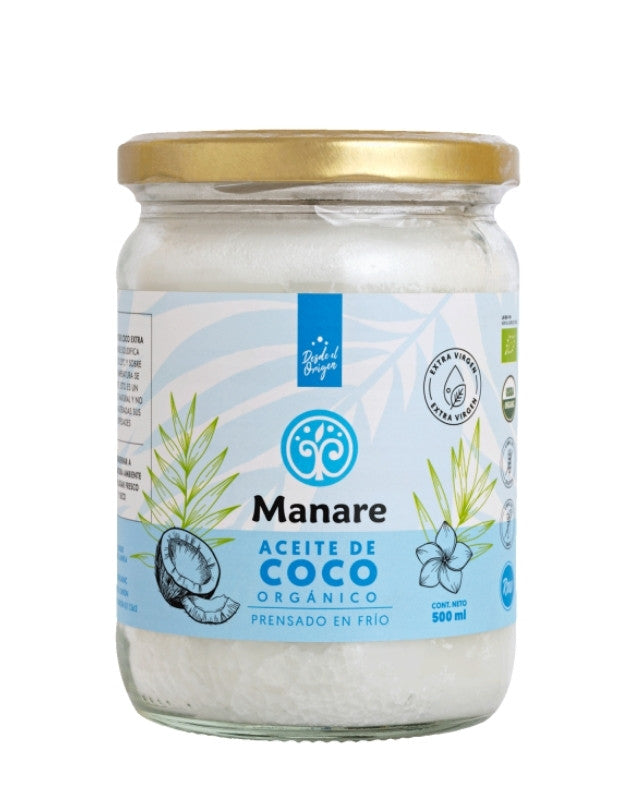 El aceite de coco Manare es: Orgánico, Extra Virgen, Prensado en frío, Raw, Sin Gluten.