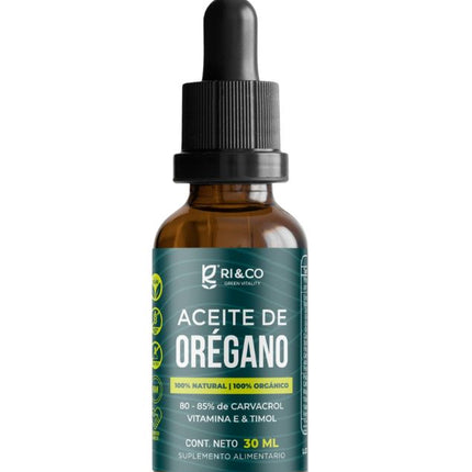Aceite de Orégano, 30 ml. Ri&Co. Este aceite esencial de orégano es 100% puro y orgánico, conocido por sus poderosas propiedades antibacterianas, antifúngicas y antivirales. Ideal para fortalecer el sistema inmunológico, aliviar la congestión respiratoria y apoyar la salud digestiva.