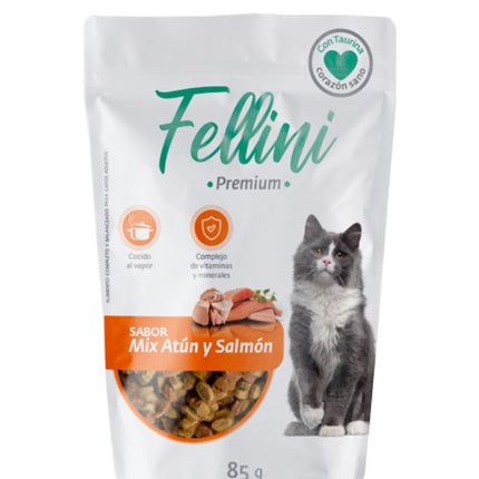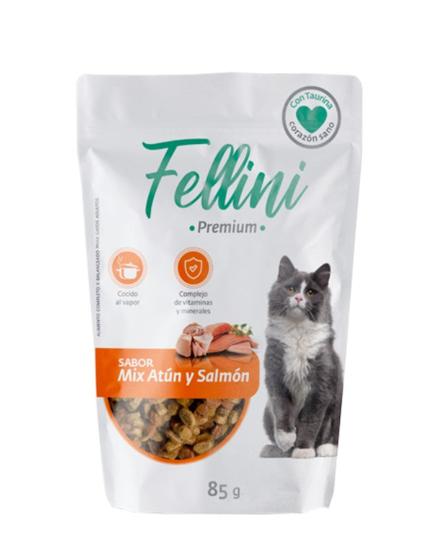 Alimento Húmedo Gatos, Atún y Salmón, 85 gr. Fellini. Alimento completo y balanceado, formulado por veterinarios. Con taurina para un corazón sano, óptimo complejo de vitaminas y minerales, Cocido al vapor.