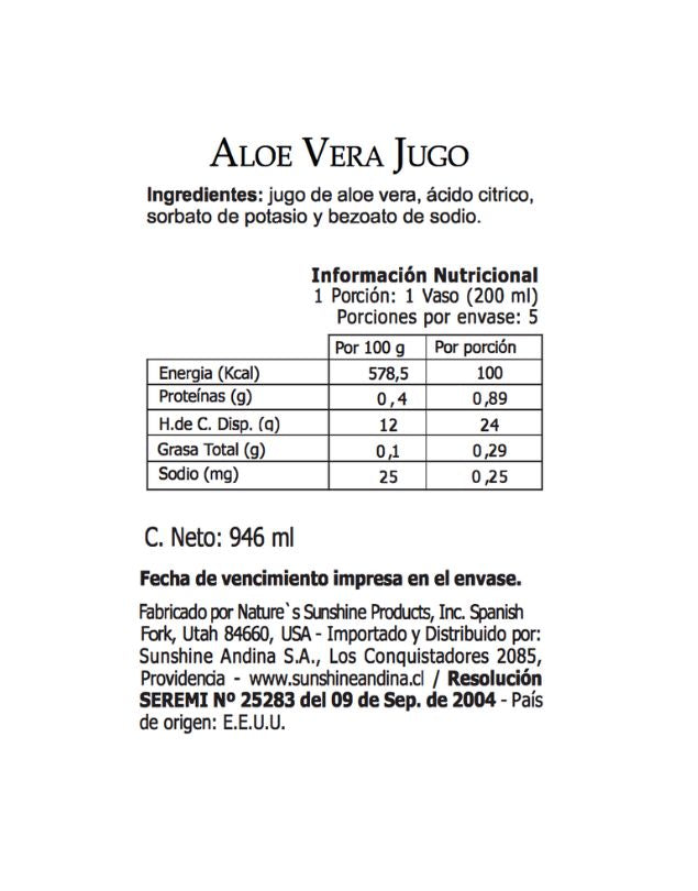 Aloe Vera Jugo, 946 ml. Nature's Sunshine. El Aloe Vera Juice, Sabila (Jugo de Aloe Vera) obtenido cuidadosamente para evitar la pérdida de vitaminas esenciales, minerales y otros constituyentes. Nutre el tracto digestivo y es bueno para la piel.