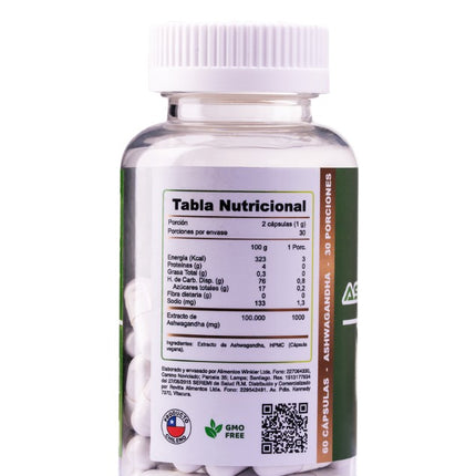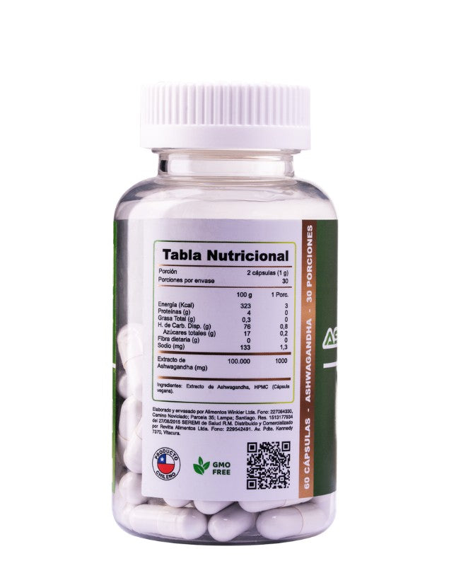 Ashwagandha, 1000 mg, 60 caps. Winkler Nutrition. La Ashwagandha de Winkler Nutrition (Withania somnífera) o ginseng indio, es una hierba medicinal tradicional de la India, del cual se utiliza tanto su raíz como hoja por sus diversas propiedades. Es conocido como un rejuvenecedor, revitalizante y promovedor de la salud.