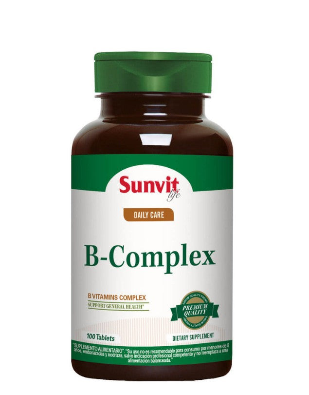 B-Complex, 100 tabs, marca Sunvit. Contribuye a fortalecer el sistema inmune además de favorecer la concentración y memoria. Contiene las 8 vitaminas del complejo B.