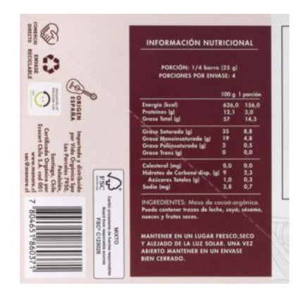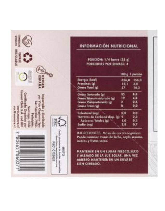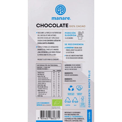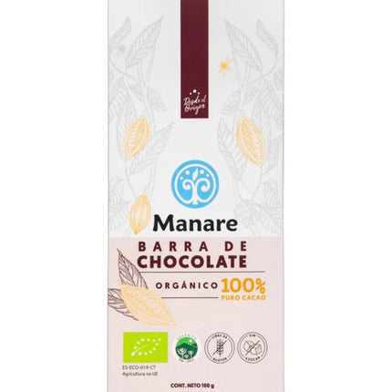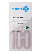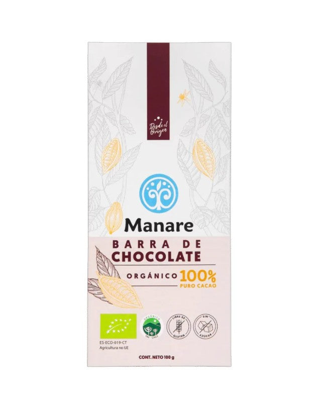 Barra de Chocolate, Organico, 100% Cacao, 100g.Manare. Chocolate puro al 100%, sin azúcar añadida. Para disfrutar del sabor más auténtico del cacao.
