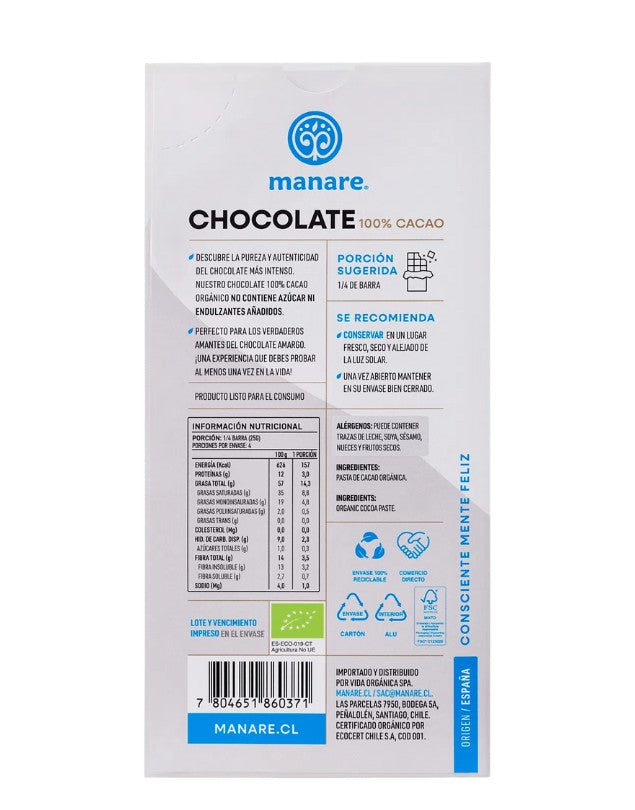 Barra de Chocolate, Organico, 100% Cacao, 100g.Manare. Chocolate puro al 100%, sin azúcar añadida. Para disfrutar del sabor más auténtico del cacao. Leer más...