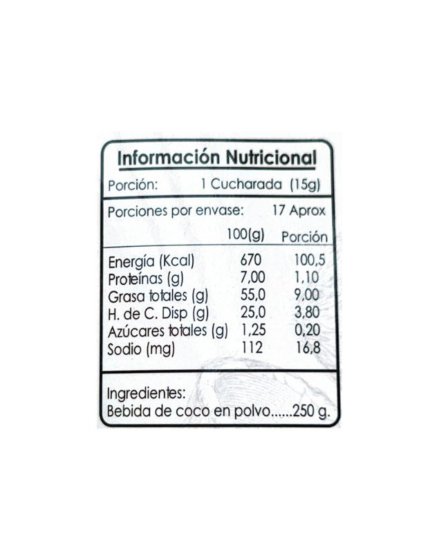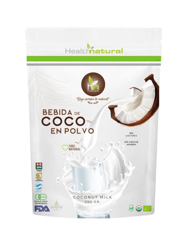 Bebida de Coco en Polvo, 250 gr. Health Natural. Es un producto obtenido de la mezcla del coco rallado orgánico, combinando con una cantidad de agua y un emulsificador orgánico. Su forma en polvo permite darle estabilidad y facilidad de poder prepararlo en cualquier momento. No contiene preservantes sintéticos y tiene un sabor muy agradable.
