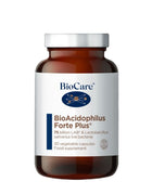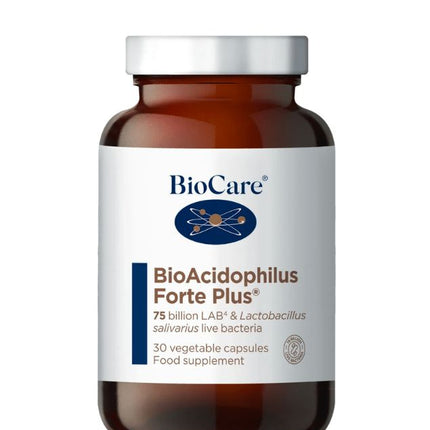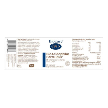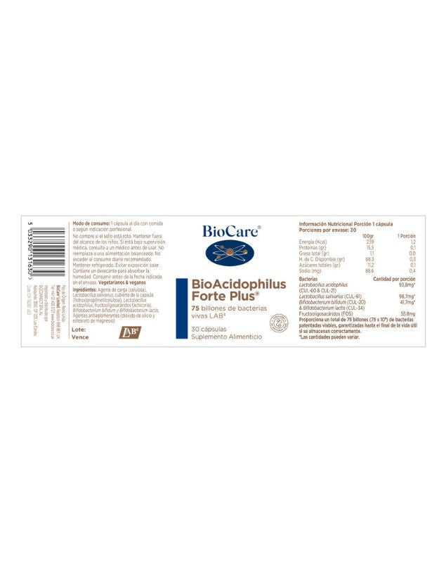 BioAcidophilus Forte Plus 75 billones, Probiótico, 30 Cáps. BioCare. Es una mezcla de alta potencia de bacterias vivas del consorcio LAB4®, junto con una quinta cepa: L. salivarius, garantizando una potencia de 75 mil millones de bacterias por cápsula. Vegano.