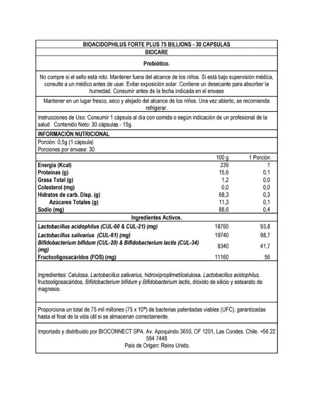 BioAcidophilus Forte Plus 75 billones, Probiótico, 30 Cáps.