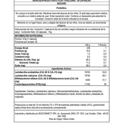 Ingredientes: Galactooligosacáridos (leche), Fructooligosacáridos, Lactobacillus salivarius,Bifidobacterium bifidum & Bifidobacterium lactis, Lactobacillus paracasei.