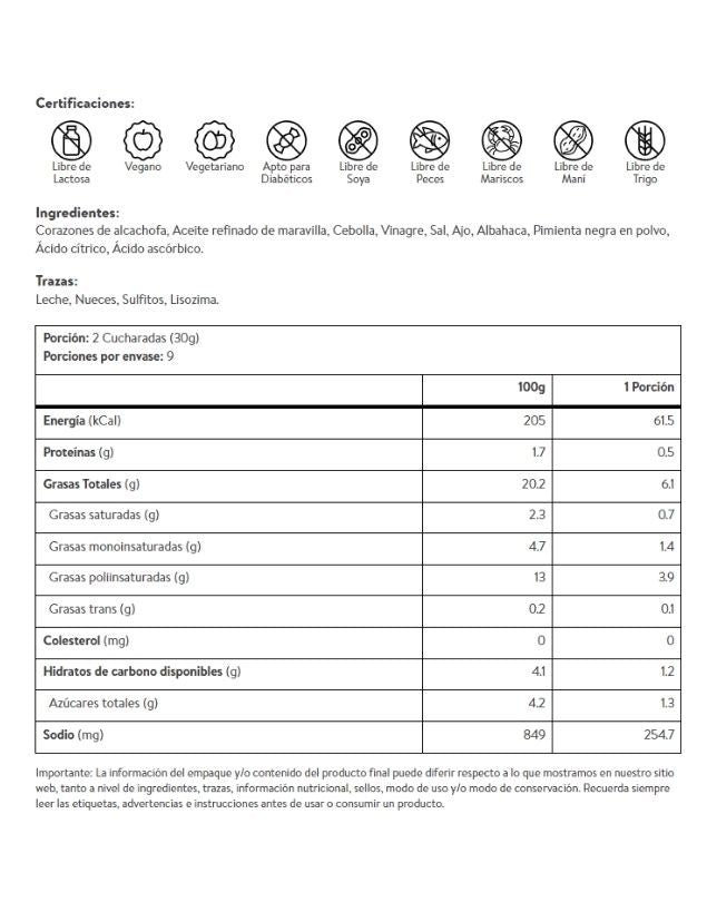 Ingredientes: Corazones de alcachofa, aceite refinado de maravilla, cebolla, vinagre, sal, ajo, albahaca, pimienta negra en polvo, ácido cítrico, ácido ascórbico.
