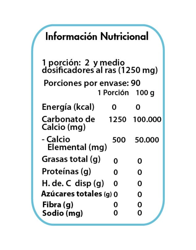 Este preparado consiste en carbonato de calcio, una de las formas con mayor cantidad de calcio elemental (40%). Este calcio es de origen mineral. No contiene ningún aditivo o químico adicional.
