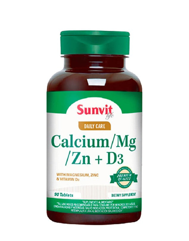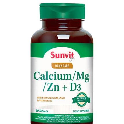 Calcio Magnesio Zinc + Vitamina D, 90 tabs., marca Sunvit.