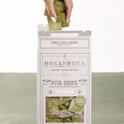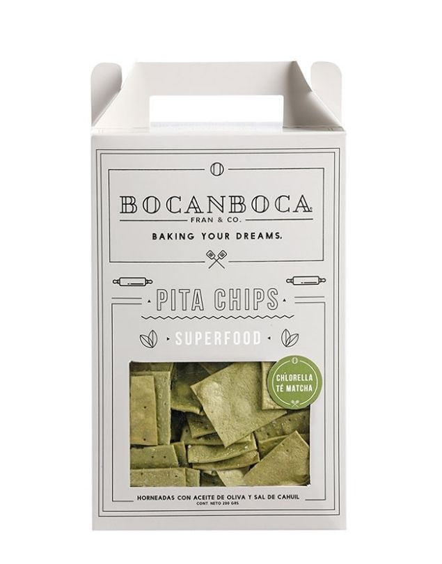 Pita chips de chlorella y matcha. Elaboradas artesanalmente, horneadas con aceite de oliva extra virgen y sal de cahuil. Son libres de colesterol, huevo, leche y soya. Apta para veganos, no contienen aditivos. Crujientes, livianas, del tamaño perfecto y se complementan con todos los sabores.