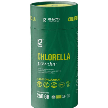 Chlorella Orgánica en Polvo, 250g. Ri&Co. Chlorella es una microalga verde rica en nutrientes y contiene beneficios desintoxicantes y nutritivos. Refuerza el sistema inmunológico, mejora la digestión, proporciona energía y vitalidad. Vegana. Libre de gluten.