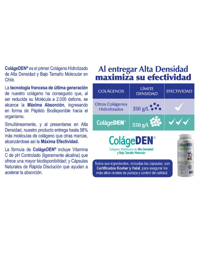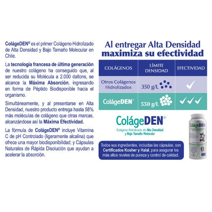 ColageDEN, colágeno, 500mg, 90 cáps. Vital & Young. Colágeno hidrolizado de alta densidad y bajo tamaño molecular. Suplemento alimenticio con ingredientes libres de gluten, lactosa, aditivos y preservantes. Vegano Leer más...