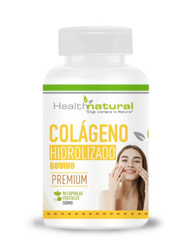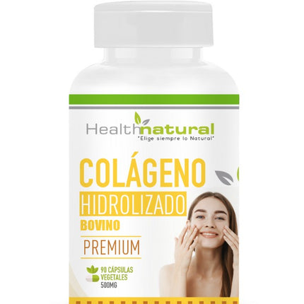 Colágeno Hidrolizado Bovino 500 mg, 90 cápsulas vegetales. Health Natural. El colágeno es una proteína fundamental para la salud y belleza de nuestra piel, cabello y uñas, ya que les proporciona estructura, firmeza y elasticidad.