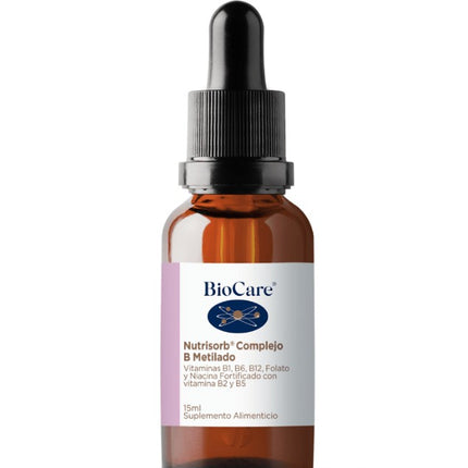Complejo B Metilado Nutrisorb, 15ml. BioCare. Un suplemento líquido en base de agua purificada formulado con vitaminas del complejo B en su forma metilada, diseñado para ofrecer alta biodisponibilidad y absorción óptima. Su formato líquido permite una administración flexible, ideal para mezclar con líquidos o alimentos y adaptarse a tu rutina diaria. Proporciona un respaldo esencial para el sistema nervioso, circulatorio e inmunológico, contribuyendo al bienestar general.