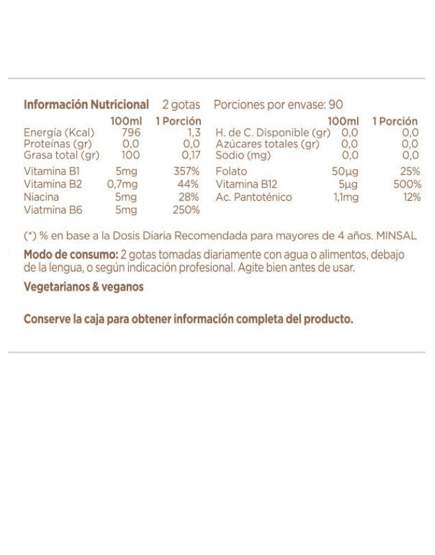 Ingredientes: Agua purificada, Vitamina. B1 (tiamina), Vitamina B6 (Clorhidrato de piridoxina), Vitamina B3 (Niacina), Vitamina B5 (ácido pantoténico), Vitamina B2 (riboflavina), goma acacia, goma xantana, sorbato de potasio, ácido cítrico, Vitamina B9 (metiltetrahidrofolato), Vitamina B12 (metilcobalamina)