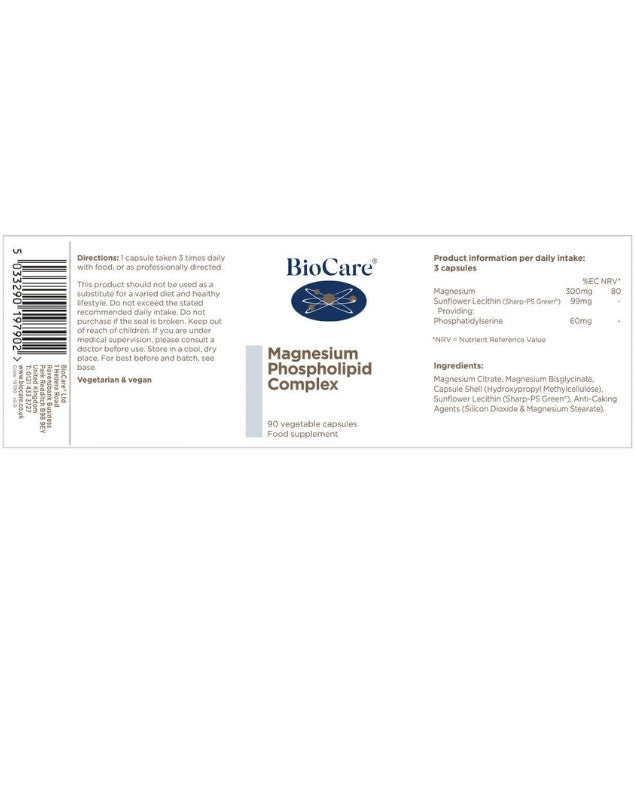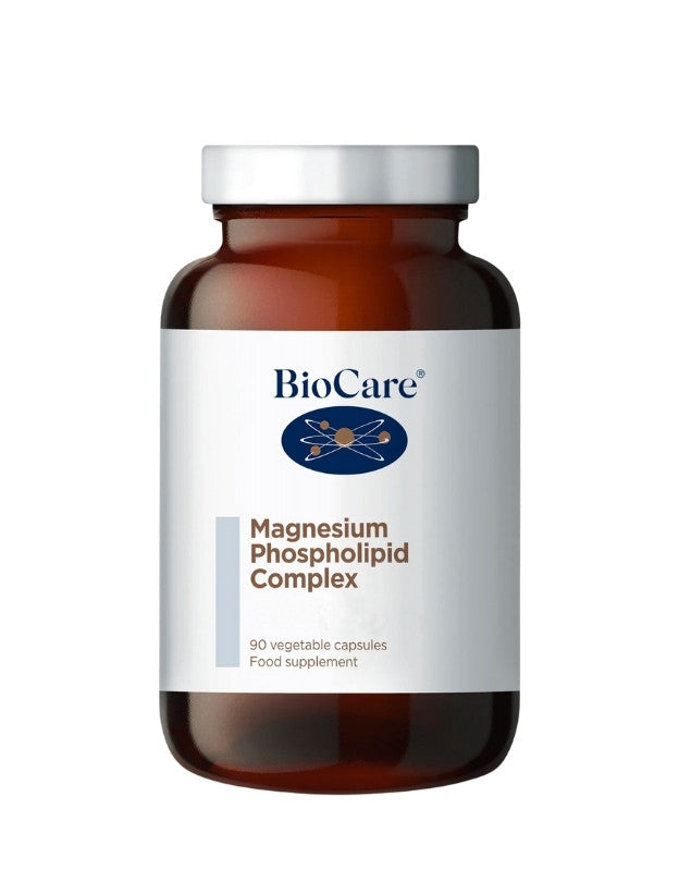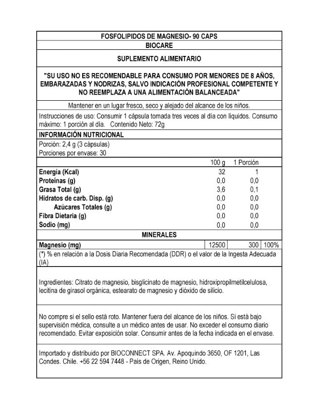 Complejo Fosfolípidos de Magnesio, 90 caps. Biocare. El complejo de fosfolípidos de magnesio es una combinación única de magnesio quelado con citrato y bisglicinato que proporciona 300mg de magnesio de alta biodisponibilidad. Apto Veganos.