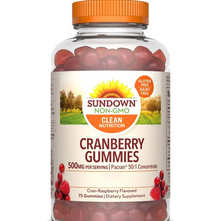 Cranberry Gummies 500 mg, 75 unidades. Sundown. Cranberry Gummies ofrece un formato amigable de consumir diariamente y 100% libre de endulzantes, colorantes y saborizantes artificiales.