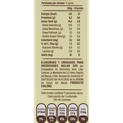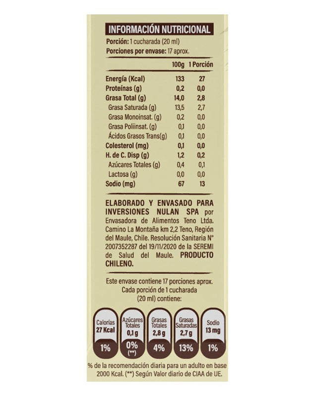 Agua, aceite hidrogenado de coco, aceite hidrogenado de palmiste, crema de coco, sucroésteres de ácidos grasos, monodiglicéridos de ácidos grasos, carboximetil celulosa, gelactomanano, goma xantán, difosfato de sodio, saborizante natural y sal.
