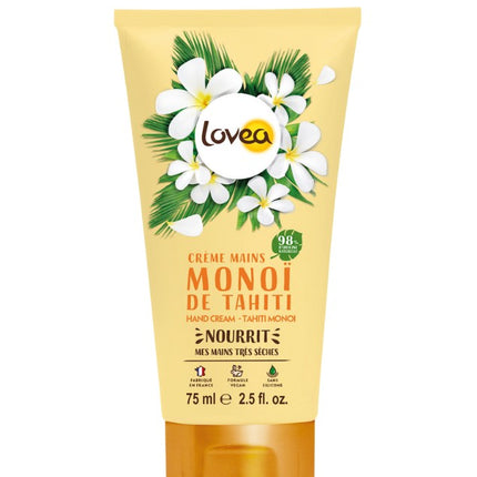 Crema de manos aceite de monoi, 75 ml. Lovea. Crema pensada para pieles secas. Nutre y aporta una sensación inmediata de confort a las manos muy secas Nuestras manos son especialmente sensibles a las agresiones diarias: al lavado habitual, a los productos domésticos o al frío en invierno.