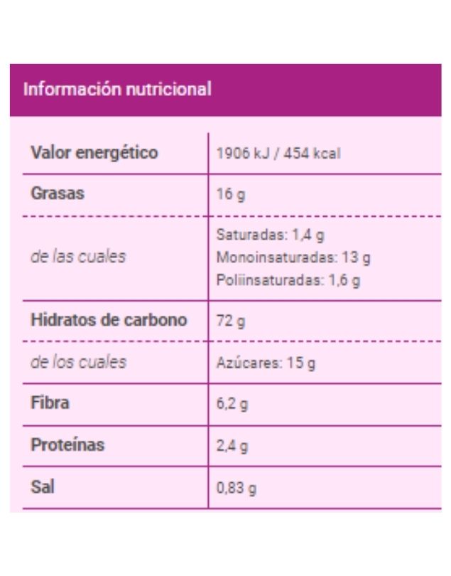 Ingredientes: Almidón de maíz, harina de maíz, aceite vegetal (girasol alto oleico), harina de arroz, azúcar, oligofructosa, almidón de arroz, sal, gasificantes (carbonato ácido de sodio y carbonato ácido de amonio), aromas, emulgente (lecitina de soja).
