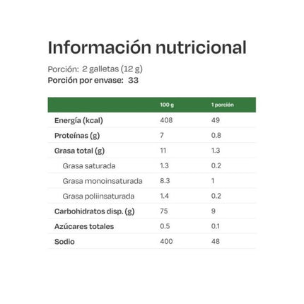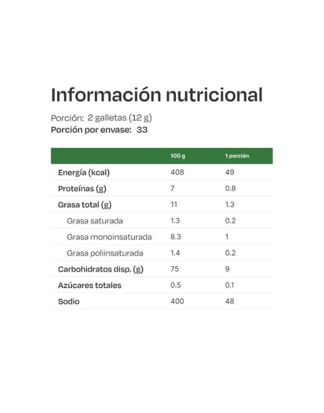 Ingredientes: Harina de trigo, edulcorante (maltitol), aceite vegetal (aceite de girasol alto oleíco), oligofructosa, gasificantes (carbonato ácido de sodio y carbonato ácido de amonio), sal, emulgente (lecitina de soja), aromas, antioxidante (metabisulfito sódico). Puede contener trazas de sésamo y leche.