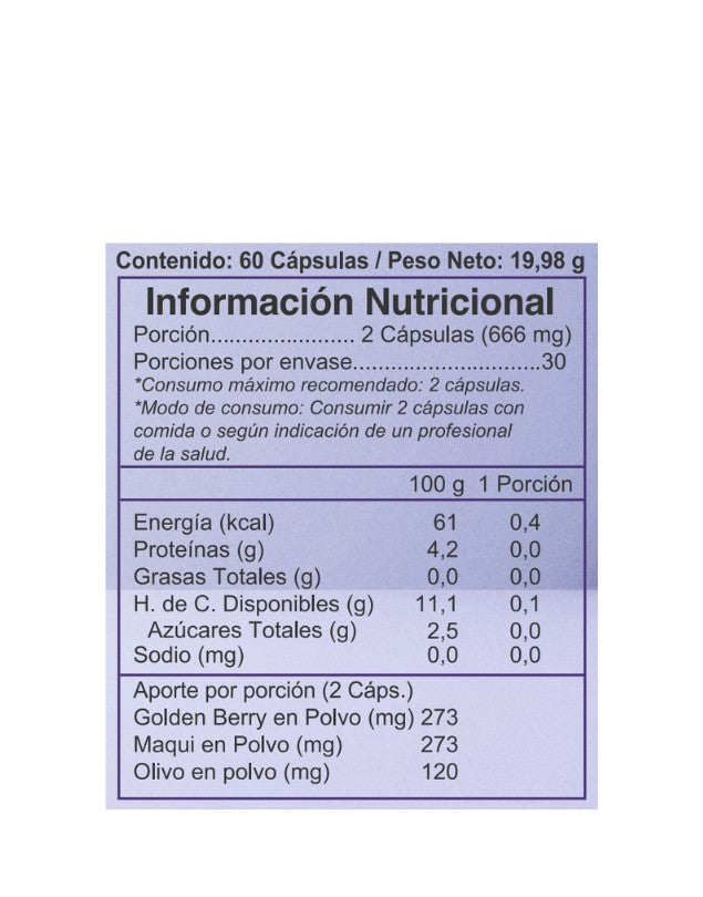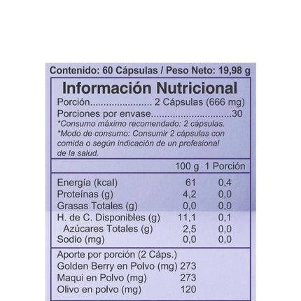 Golden Maqui, 60 caps. 3R. Explora una mezcla única con Golden Maqui, una fórmula rica en ingredientes de origen natural que ofrecen antioxidantes y nutrientes para complementar tu nutrición diaria. Perfecto para quienes valoran un enfoque equilibrado.