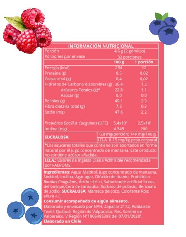 • Basillus Coagulans: Cada gomita contiene probiótico Bacillus coagulans, conocido por promover un equilibrio intestinal y mejorar la digestión, junto con inulina, un prebiótico que alimenta estas bacterias beneficiosas. Además, el jugo concentrado de manzana y la manteca de coco aportan un sabor irresistible y cremosidad. Delicioso sabor frutos del bosque.