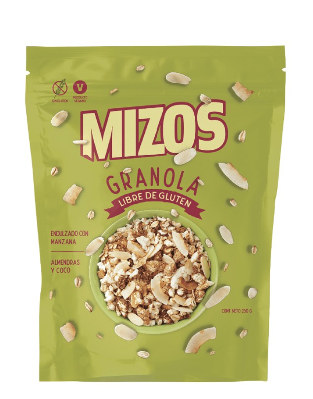 Granola almendra coco, 250 g. Mizos. Empieza el día con nuestra granola con almendras y coco, que es una fuente de energía para el desayuno. Nuestra base es avena libre de gluten, endulzada con jugo de manzana.