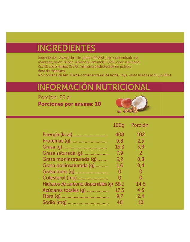 INGREDIENTES Hojuelas de avena entera y laminada libre de gluten, jugo concentrado de manzana, arroz inflado, almendra laminada, coco laminado, coco rallado manzana deshidratada en polvo y fibra de manzana.
